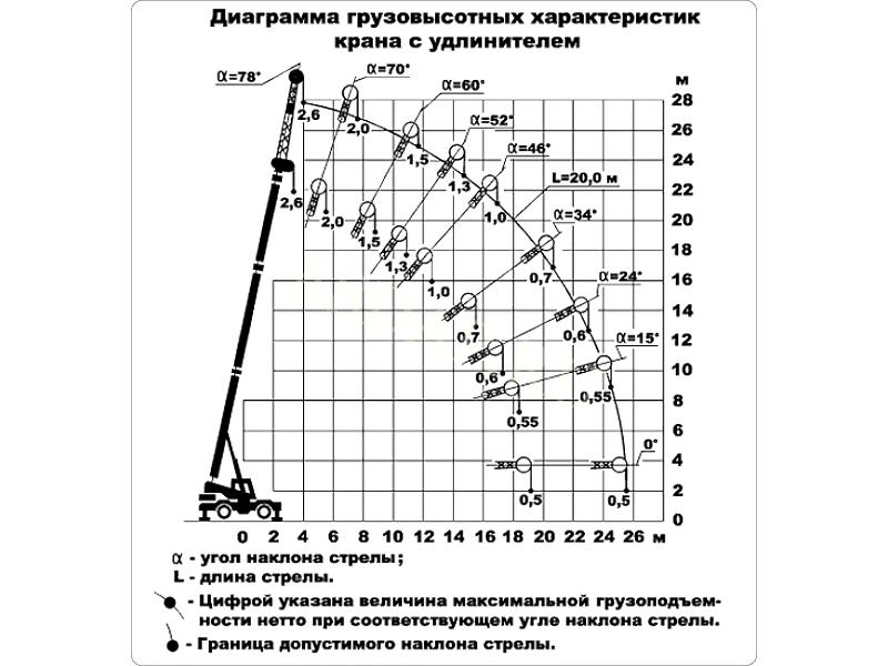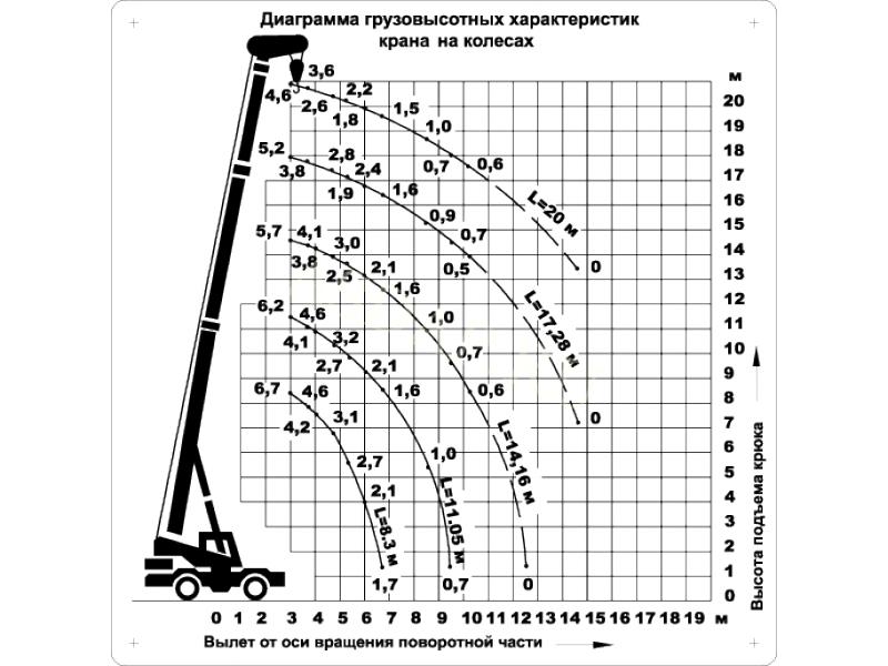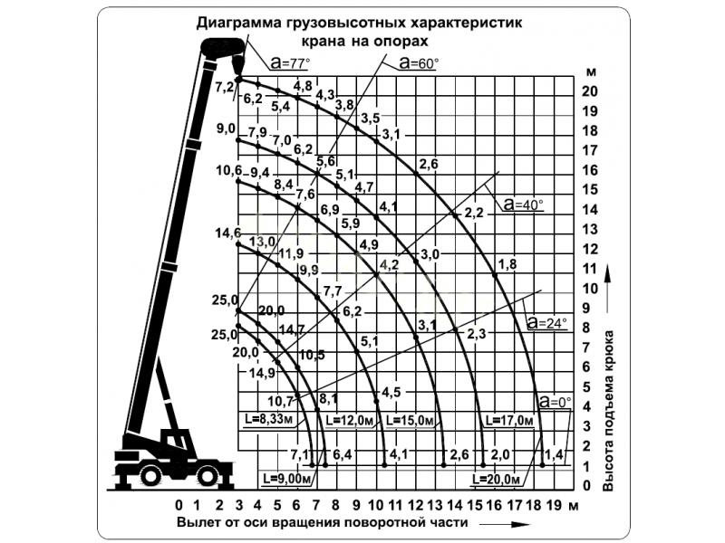 Грузоподъемность на колесах - 6,75 т; Максимальный грузовой момент - 80 т/м; Базовое шасси - собственное; Колесная формула - 4х4х4; Двигатель дизельный - ЯМЗ 236 М2; Мощность - 132 (180) кВт (л.с.); Зона выполнения грузовых операций, град - 360° (круговая); Высота подъема: - с основной телескопической стрелой - 20,5 м; - с удлинителем - 27,5 м; Скорости подъем... подробнее